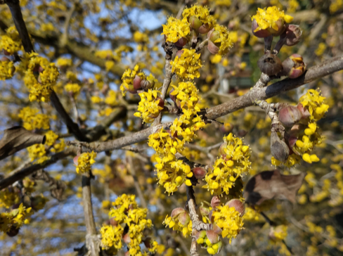 - Waarom deze boom: De Gele Kornoelje is een kleine boom of grote struik die goed gedijt in verschillende bodems en omstandigheden, inclusief droogte. Hij produceert weinig afval en heeft aantrekkelijke gele bloemen in het vroege voorjaar, gevolgd door eetbare bessen.